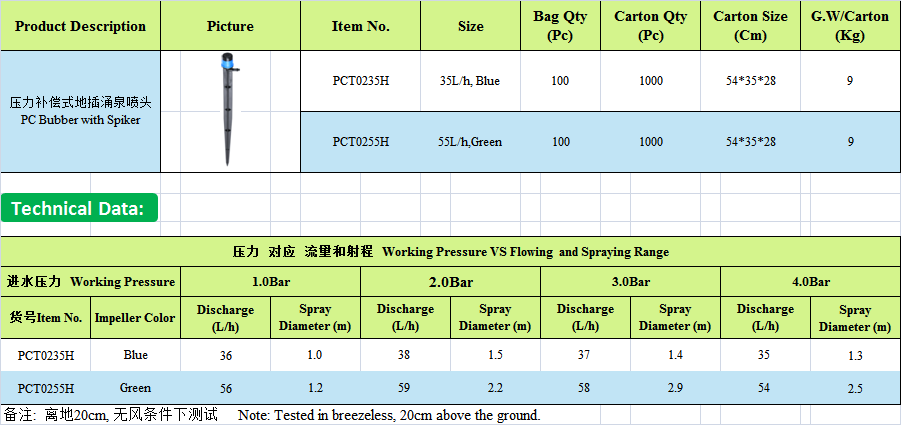 Aliran dan julat boleh laras untuk tujuan berbeza: Memercikkan pengairan, pengairan titisan atau ditutup. Bentuk semburan yang berbeza untuk tumbuhan yang berbeza: jenis jejari dan jenis emparan.