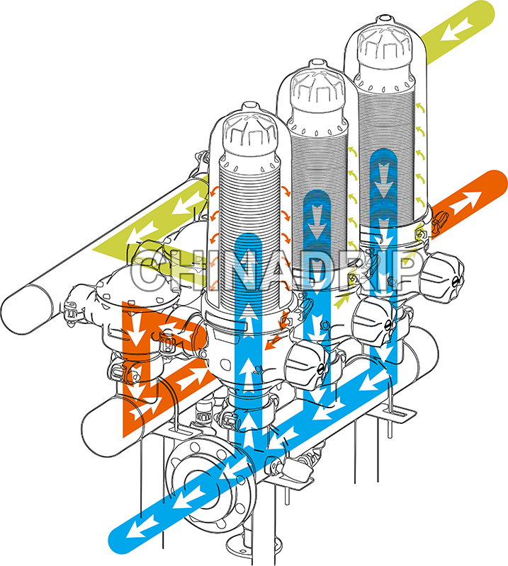 Proses Penapisan: Pengawal mengawal arah injap cuci belakang untuk membuat penapis memasuki peringkat penapisan: Air sumber memasuki penapis melalui paip masuk sistem, injap cuci belakang dan masuk penapis satu demi satu. Kemudian kotoran dihentikan oleh cakera dan air bersih melalui saluran keluar penapis ke paip keluar sistem.