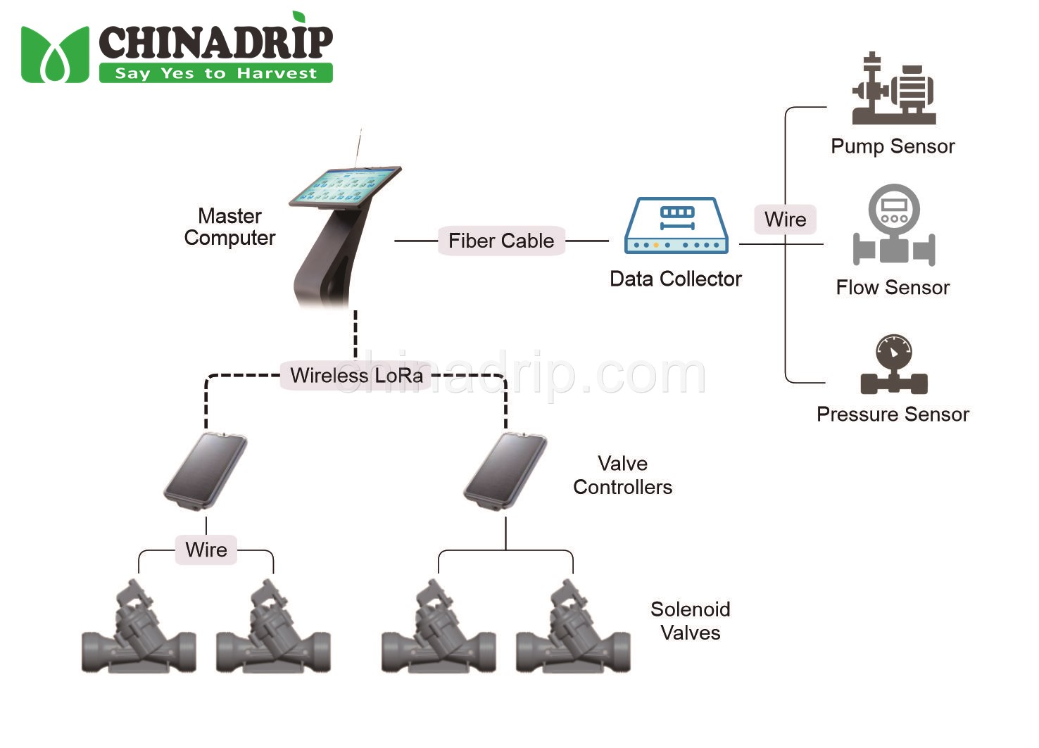 Untuk mengumpul data pengairan: EC, pH, Aliran, Tekanan. Ia memasukkan nilai data ini ke komputer induk untuk tontonan dan rakaman masa nyata.